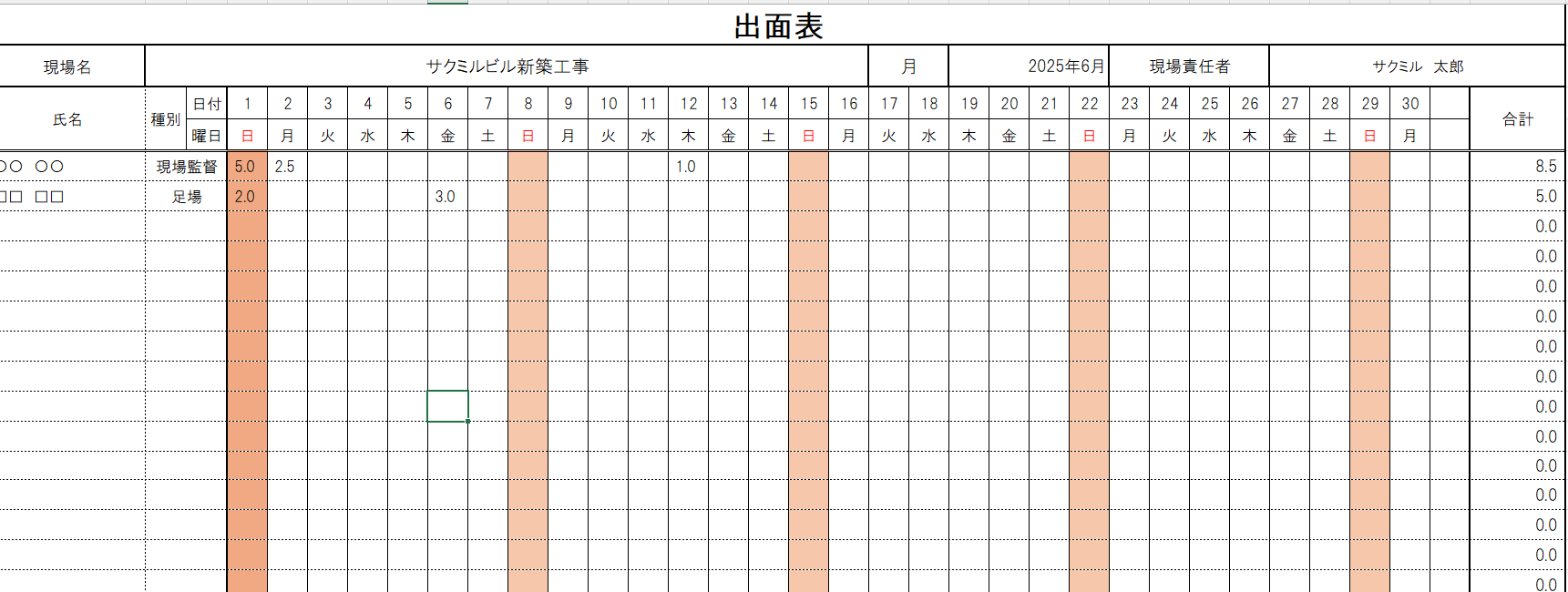 年月入力だけで日付と曜日が自動反映され、土日祝日などには背景色が付く機能があると、便利です。サクミルテンプレートでは、日曜の着色が標準装備されています。 - 自動集計機能(SUM・IF・AVERAGE 等)