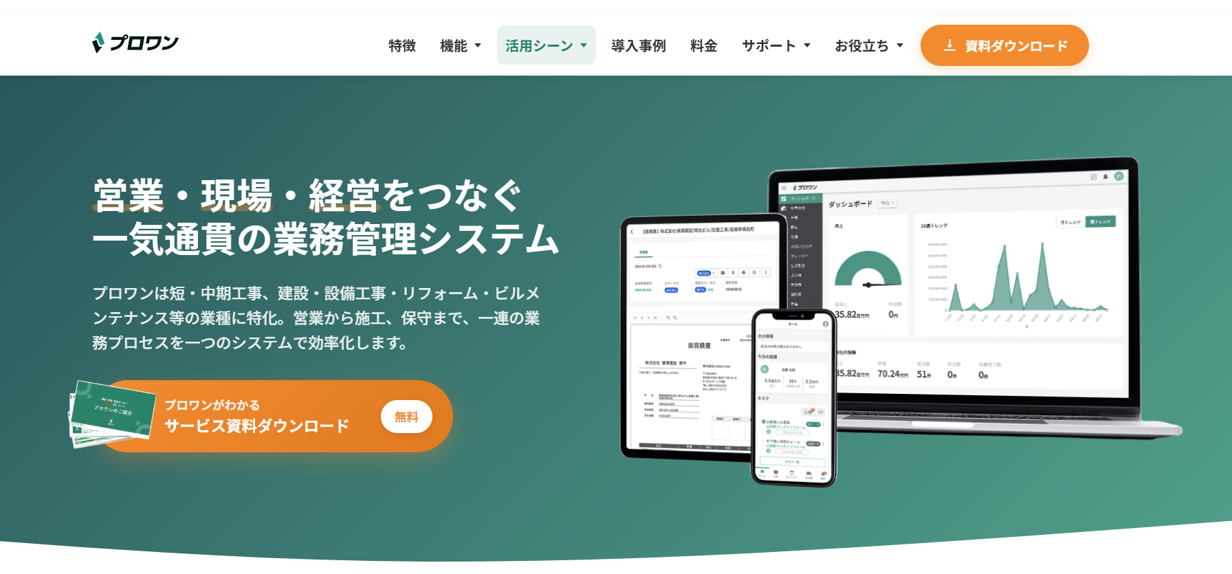 プロワンは、短期工事・リフォーム・設備工事など、“現場仕事”を中心とする中小企業に最適なオールインワン業務支援SaaSです。顧客管理、営業支援、差配、見積〜発注〜請求までの業務を標準搭載し、帳票のデジタル化・モバイル対応を強化。事務作業を削減して現場対応を迅速にし、売上・顧客満足度を高めることが期待できます。実際、「プロワン」導入企業では事務作業量が約30%減、売上が20%向上したという報告があります。現場とバックオフィスをつなぎたいけれど、複数システムを使って煩雑になっている会社に特におすすめです。操作に不慣れな社員が多い場合は、導入支援やトレーニング体制を確認するとよいでしょう。