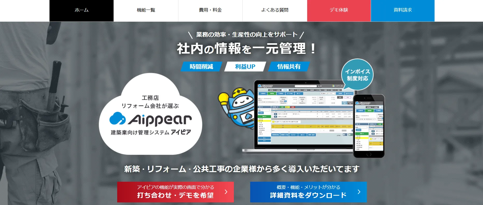 主な機能: 見積作成、請求管理、原価管理、粗利管理、案件管理、工程管理、顧客管理、スケジュール、写真台帳、ファイル管理、経営レポート