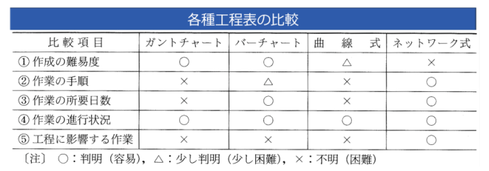 なお、これら5種類の工程表について、作成難易度や手順などを比較すると、下表のようになります(*グラフ式と工程管理曲線を、まとめて「曲線式」として記載)。