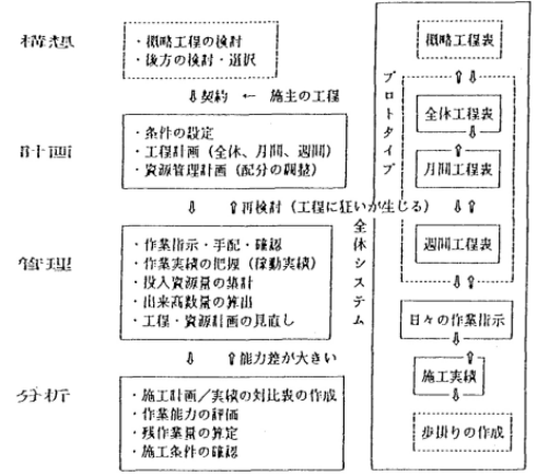 一方、積み上げ型のボトムアップでは、過去にあまり経験がなく、現場の施工条件からみて具体的 に掘下げて、追加する必要があると考えられる工事に対しても検討することができます。工程表に記載すべき工程計画内容について、部分的にシミュレートして、種々の工程関連事業の内容を確認することができます。