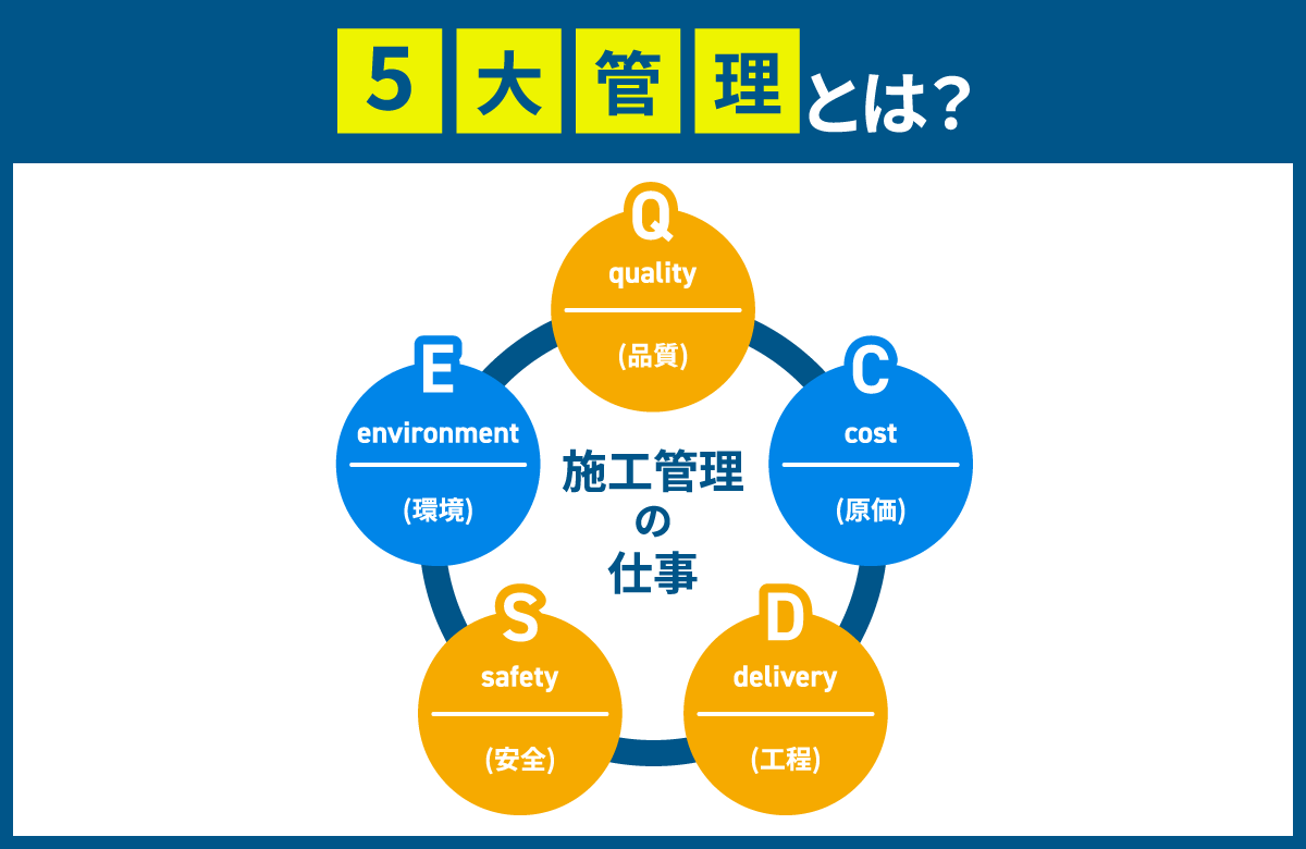 施工管理における「5大管理」は、プロジェクトを計画通りに進め、品質や安全性を確保するために重要な5つの管理項目で、Q:品質、C:コスト、D:工期・工程、S:安全、E:環境の5項目を指します(M:モラルを含める場合もあります)。それぞれを詳細に理解することで、プロジェクトの成功率を高めることができます。