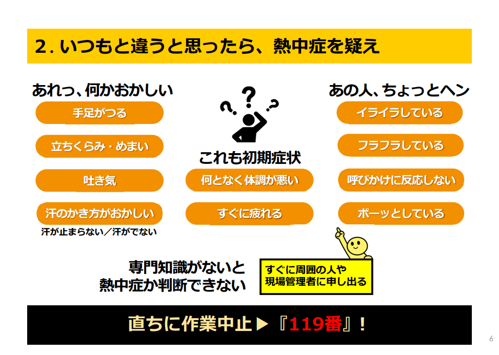 「熱中症予防労働衛生教育」の管理者向け教育では、熱中症の症状、熱中症の予防方法、緊急時の救急処置、熱中症の事例などを体系的に学びます。 - 協力会社にも同等の周知徹底