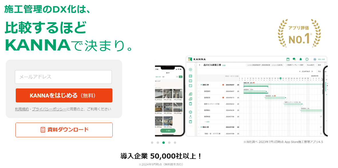 「KANNA」は、複数の工事現場を一括で管理できる建設業向けの業務支援アプリです。進捗状況をカレンダーやボード形式で表示でき、リアルタイムの情報共有にも対応しています。